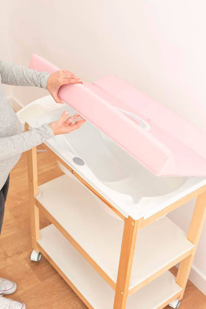 - El mueble lleva integrada la tapa de la bañera. Una tapa que lleva integrada la colchoneta, es abatible y resulta muy cómoda de abrir y cerrar. Incluso cuando tienes a tu bebé en brazos.