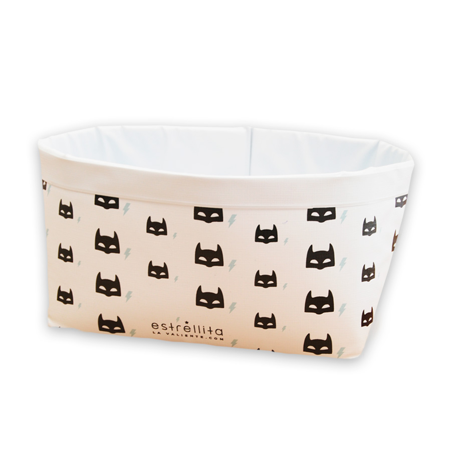 Cesto pequeño de almacenaje Batman, decorado la máscara de Batman en negro y rayos en mint. Es una pieza original de Estrellita La Valiente. Se ha realizado con PVC de color blanco decorado con detalles de máscaras en negro, así como con rayos de colores mint. Es un objeto que da un aire elegante y mágico a la habitación en la que se encuentra.