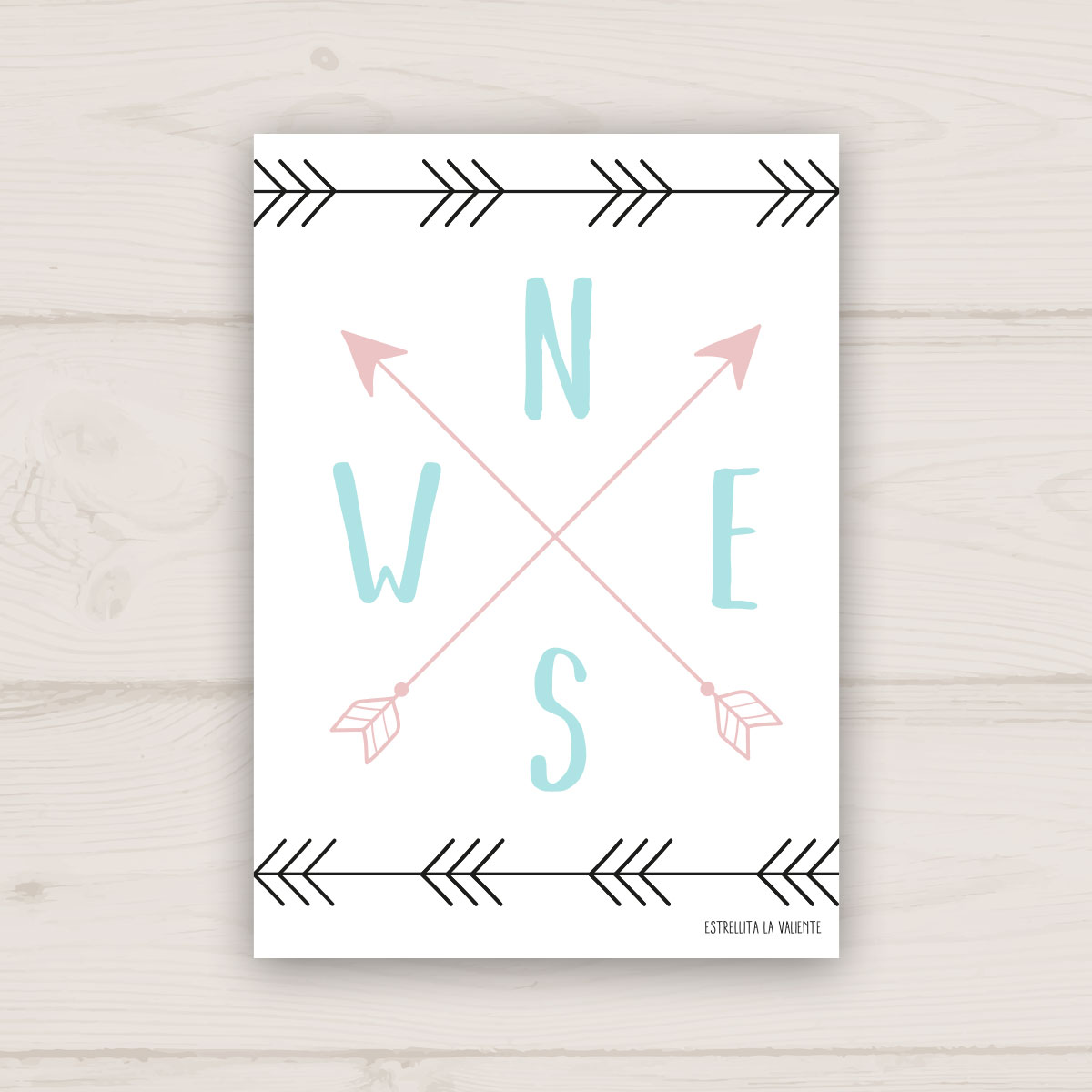 Se trata de una bonita estampa realizada en papel couché de 350 gramos de color blanco con múltiples colores en los diferentes elementos que componen la escena. En este caso, los cuatro puntos cardinales indicados únicamente con su inicial de la palabra de cada punto cardinal en inglés (west, south, east and north). Se completa el cuadro con unas flechas de color rosa entre ellos, imitando a una brújula.