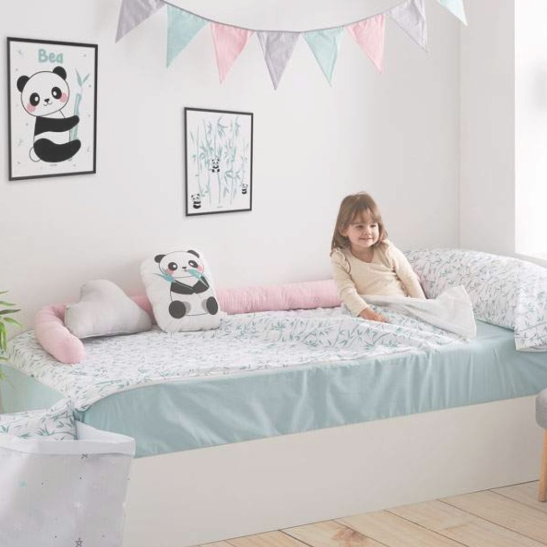 • Cama tipi colección Bambú. Funda nórdica, banderines, cojín cuadrado y cortina de la colección Bambú. Cojín Panda, rulo protector en liso gris y cojín estrella en mint. Estrellita la Valiente.