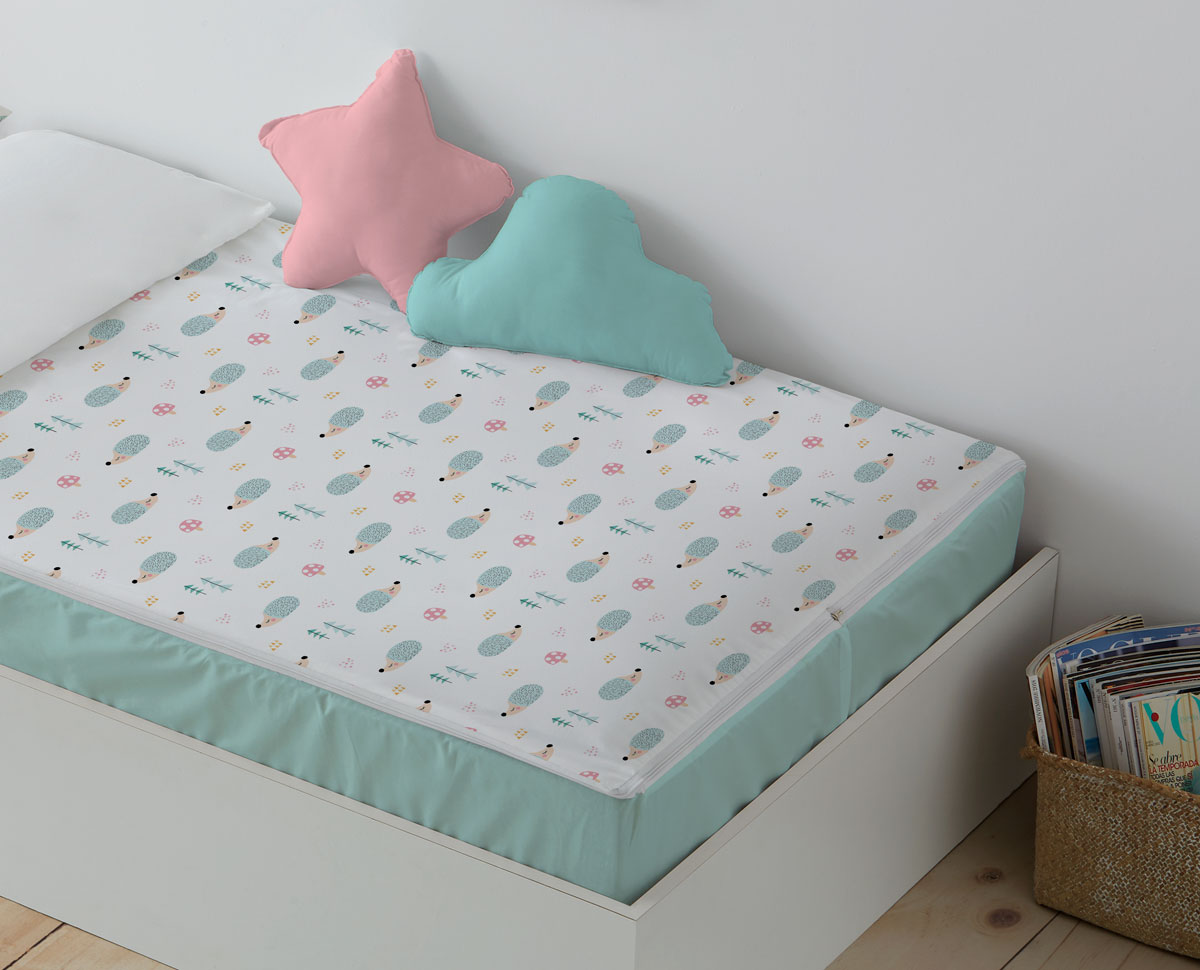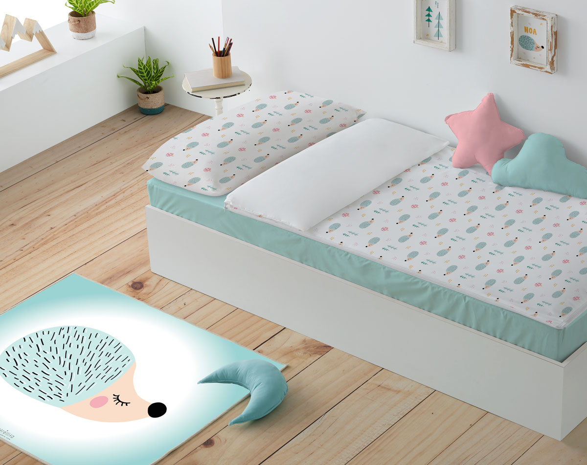 Saco nórdico con estampado Ericete + sábana bajera mint (con cremallera para unir a la funda) + funda de almohada.